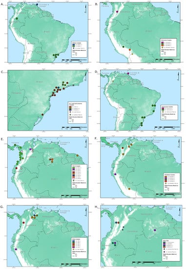 Geographic distribution of subgenus Kerteszia clusters from COI species delimitation analyses: (A) Bellator complex; (B) Boliviensis complex; (C) An. cruzii and Laneanus complex; (D) Homunculus complex; (E) Neivai complex; (F) Pholidotus complex; (G) Rollai complex; (H) other Kerteszia taxa.
