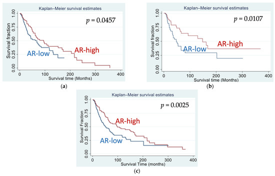 Kaplan–Meier survival curves for patients with high and low AR protein levels. (a) For both male and female patients; (b) for female patients; (c) for male patients (p values are derived from log rank test).
