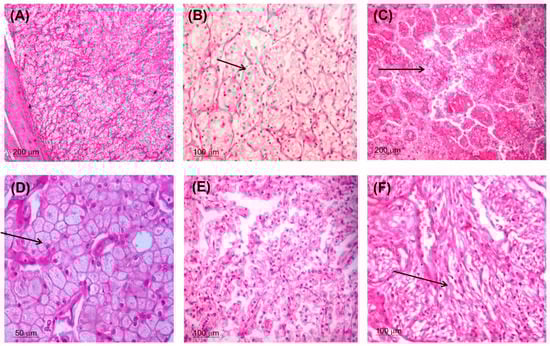 Morphological types of RCC. Clear cell type ((A) ×100 and (B) ×200) with clear cytoplasm, well defined cell borders, and nuclear grade 2 (black arrow). Papillary RCC ((C) ×100) showed papillary structures with core containing foam cells (black arrow) and covered by columnar cells. Chromophobe RCC ((D) ×400) formed of nests of cells with abundant eosinophilic cytoplasm and raisin nuclei (black arrow). RCC with variable features suspected to be unclassified type that need genetic study ((E) ×200). RCC with sarcomatoid features (black arrow) and considered grade 4 ((F) ×200).