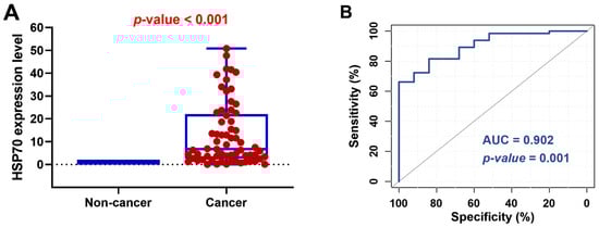 HSP70 gene expression profile. (A) Expression in non-cancerous and cancerous renal tissue of renal cell carcinoma (RCC). Data are represented as medians. The box defines upper and lower quartiles (25% and 75%, resp.), and the error bars indicate upper and lower adjacent limits. Expression levels of HSP70 were normalized to GAPDH. Fold change was calculated using the delta-delta CT method (2−ΔΔCT) compared to normal renal tissues. The median and quartile values of patients are demonstrated in blue. The dashed line represents the expression level of non-cancerous renal tissues (equivalent to 1.0). The Mann–Whitney U test was used for comparison. (B) Receiver operating characteristic curve analysis of HSP70 expression level for discriminating patients with RCC from the non-cancerous group. AUC: area under the curve. p-value < 0.05 was considered statistically significant.