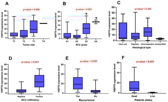 Association of HSP70 gene expression with clinicopathological characteristics. (A) Tumor size, (B) Pathological grade, (C) Histological subtype, (D) Capsular infiltration, (E) Recurrence, and (F) Mortality. Mann–Whitney U and Kruskal–Wallis tests were used for comparison. p-value < 0.05 was considered statistically significant. * Significance versus G1, # Significance versus G2.