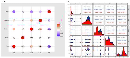 Correlation matrix of HSP70 expression levels and clinicopathological characteristics of renal cell carcinoma (RCC). Correlation plot showing the relation between HSP70 expression and the clinicopathological characteristics in RCC patients. OS: overall survival, T: tumor size, FC: fold change. Pearson correlation analysis was employed. (A) Overall analysis. (B) Stratification by sex. Male in red and female in blue. * p < 0.05, ** p < 0.01, *** p < 0.001.