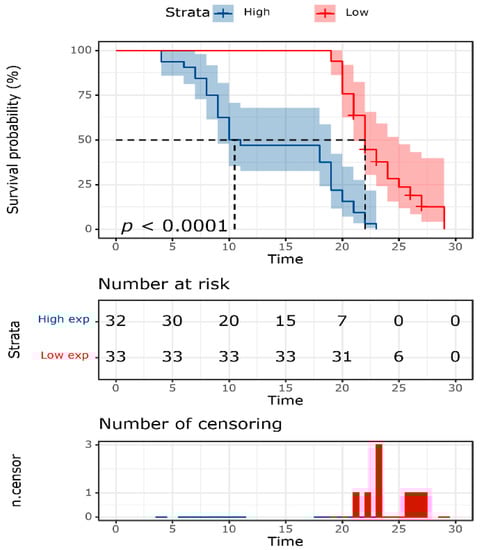 The average OS of RCC patients was 18.45 ± 0.84 months. Patients with high HSP70 expression had reduced OS compared to their counterparts (13.6 ± 1.09 months vs. 23.1 ± 0.6 months, p < 0.001) (Figure 5).