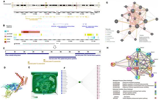 Structural and functional analysis of HSP70 (gene name: HSPA4). (A) The chromosomal location of the studied gene and the related transcripts. (B) The cis (e.g., promoter and enhancer sequences) and trans (e.g., CCCTC-binding factor; CTCF) acting regulatory factors. (C) The 840 amino acid HSP70-related protein product with the different domains and conserved sites. (D) The predicted 3D structure of HSP70 generated by “SWISS-modelling”. (E) The subcellular localization of HSP70. The color degree is related to protein abundance. (F) The transcriptional factor (TF)-miRNA coregulatory interactions include 23 TFs (red diamonds) interacting with the specified gene and 16 microRNAs (blue squares) targeting HSP70 generated by “Network Analyst 3.0”, filtered by the type of tissue (kidney). (G) The “gene- gene interaction network” generated in GeneMania using homo sapiens HSPA4 as a driver gene. (H) The protein-protein interactions network with the top biological processes, molecular functions, and pathways created by the “STRING database”. Each interacting node with the hub HSP70 represents the top 10 predicted functional protein partners with a high level of confidence. The average node degree was 13.8, the average local clustering coefficient was 0.82, and the PPI enrichment p-value was <1.0 × 10−16.