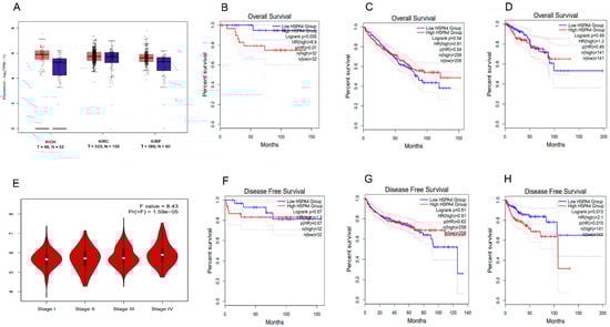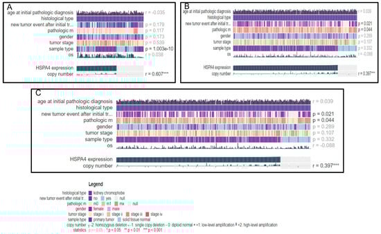 The MEXPRESS database linked the HSP70 (HSPA4) gene to the age of initiation, recurrence, metastasis, tumor stage, sample type, and OS in the three distinct RCC subtypes. The default MEXPRESS plots from different RCC sample subtypes (KICH (n = 149), KIRC (n = 980), and KIRP (n = 380)) are shown in Figure 8A–C, with the samples sorted based on the HSP70 expression value. The Pearson correlation coefficients varied from 0.035 to 0.60, and the p-value for the comparison of expression with new tumor occurrence and pathological metastasis was 0.021 and 0.04 in KIRC and KIRP, respectively, using the Wilcoxon rank test.