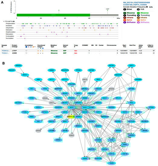 cBioPortal database genomic and network analysis of HSP70 in renal cell carcinoma (RCC). (A) Missense mutations that could impact the HSP70 expression level in RCC. (B) HSP70 is one of the validated targets for C-MYC transcriptional activation.