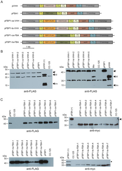 Western blots to assay accumulation of transgenic protein were performed as described previously [23] with minor modifications. Cells of transformants were cultured in 25 mL TAP medium (supplemented with 100 µg/mL spectinomycin) to mid-log phase, pelleted by centrifugation at 3000× g for 5 min, mixed with 200 µL lysis buffer (4% SDS, 100 mM Tris pH 6.8, 10% glycerol, and 100 mM DTT) and boiled for 5 min. Protein extracts from the cells were loaded onto 12% SDS-PAGE gels and electrophoresed at 100 V for 85–100 min. The proteins were transferred to a nitrocellulose membrane (Amersham-Protran; GE Healthcare, Silver Spring, MD, USA) in a Mini Protean Tetra Cell (Bio-Rad) set to 21 V and 50 milliamps. The following day, the membrane was blocked with 5% milk (10% Carnation non-fat) for one hour. To detect FBP1 and VHH proteins, the membrane was probed with a primary anti-FLAG mouse monoclonal antibody (Sigma-Aldrich, Inc., St. Louis, MO, USA) diluted 1:2000 in 2 mL of 1X PBST (0.01% Tween in phosphate-buffered saline) with 0.06 g Bovine Serum Albumin (BSA) (Sigma-Aldrich) for 1 h. The membrane was then probed with a secondary goat anti-mouse IgG antibody-HRP conjugate (diluted 1:40,000 in 40 mL of 5% milk solution) for 30 min. To detect atpB protein, the membrane was reacted with a primary rabbit polyclonal anti-atpB-antibody (Agrisera, Vännäs, Sweden) diluted 1:2000 in 2 mL of 1X PBST with 0.06 g BSA for one hour, then probed with a secondary goat anti-rabbit IgG antibody diluted 1:40,000 in 40 mL 5% milk solution for 30 min. To detect FBA1 protein, membranes were probed with a primary anti-myc mouse monoclonal antibody (Active Motif, Carlsbad, CA, USA) diluted 1:2000 in 2 mL of 1X PBST with 0.06 g BSA for one hour. After that, the membrane was probed with a secondary goat anti-mouse IgG-HRP conjugate antibody diluted at 1:40,000 in 40 mL of 5% milk solution for 30 min. The membrane was washed 5 times with 1X PBST, developed with Super Signal West Femto Maximum Sensitivity Substrate (Thermo Fisher Scientific) for 5 min, and exposed to X-ray film.