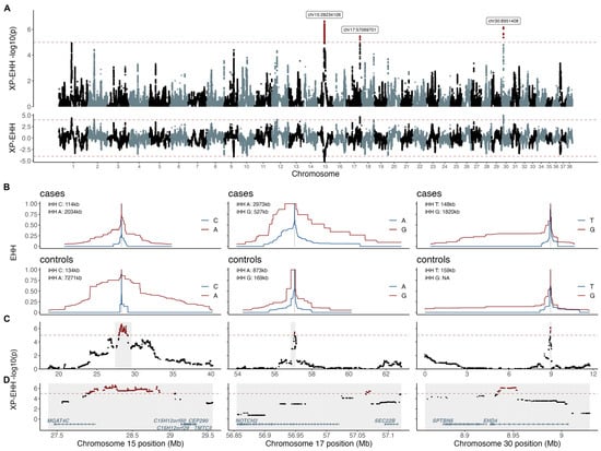 XP-EHH analysis defined three candidate regions under selection. XP-EHH p-values and XP-EHH values are presented across the whole genome (A). The candidate regions under selection are presented as EHH plots in cases and controls for chromosomes 15, 17, and 30 with haplotype lengths indicated by integrated extended haplotype homozygosity (iHH) for the respective alleles in cases and controls (B). XP-EHH p-values corresponding to the iHH regions (C) and zoom-ins around the top selection variants (shaded in grey) are presented with the annotated protein coded genes in (D).