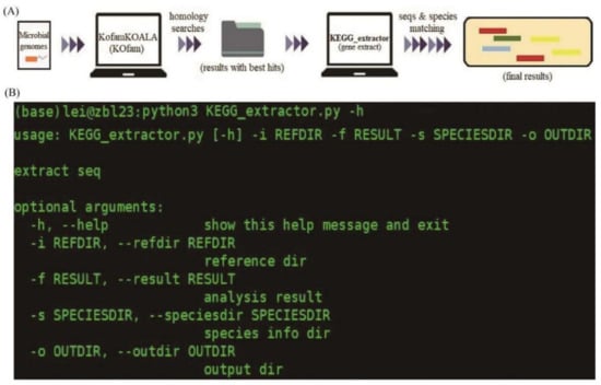 The KO database is a collection of orthologs, most of which are members of the KEGG molecular networks, including KEGG pathways, BRITE hierarchies and KEGG modules. Using the genome annotation procedure in KEGG, about 46% of 17 million genes can be annotated with K numbers [16]. Therefore, the sequence similarity search against the GENES database is a search for the most appropriate K numbers, which can easily be computerized as implemented in the KOALA programs. Thus, after achieving sequence alignments and KEGG annotation of all the proteins using the KofamKOALA, as mentioned above, the generated results are merged and processed for the next sequence extraction and classification. Unless specified otherwise, the program will use default values for the parameters. The workflow for KEGG_Extractor is shown in Figure 1A. The tool uses the logic of keyword matching and extracts the gene sequences from the genome files by reading the information of the specific columns of the input files. If the option -i is specified, the corresponding coding sequences of all genes will be scanned based on the annotation files generated by the KEGG tools as the program runs. Option -f will automatically read the processed files of the KEGG annotations with KO entries, while option -s means that the species information of each gene will be checked from the genomic assembly files and added into the results. Examples can be checked and downloaded from the online data of GitHub (https://github.com/xielisos567/KEGG_extractor, accessed on 24 September 2022. Command-line use of the KEGG_Extractor is shown below: python3 KEGG_extractor.py [-options]/{-i <directory> -f <processed files> -s <assembly files> -o <directory>} (Figure 1B).