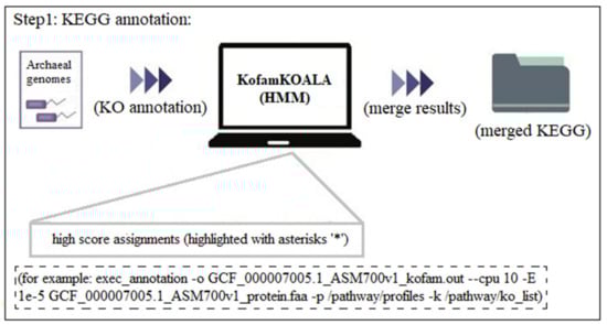 (2) The dependent software for KofamKOALA had also been downloaded and installed, including the Ruby (version ≥ 2.4) and HMMER (version ≥ 3.1). The running command of KofamKOALA was exec_annotation and the E-value parameter was set to 1 × 10−5. After homologous searching in the genomes, the high score assignments highlighted with asterisks ‘*’ in the output were chosen for further analysis.