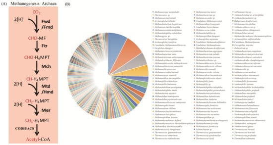 CODH/ACS has been generally thought to be a feature of most methanogenic archaea (Figure 4A), as well as some acetogenic, carboxydotropic, aceticlastic and sulfate-reducing bacteria [31,32]. After genome annotation with the KofamKOALA in 1199 reference genomes of the Archaea (5 January 2022) and sequence extraction with the KEGG_Extractor, the extracted sequences underwent de-redundancy using CD-HIT (identity: 100%). A total of 982 non-redundant genes of archaea were finally obtained, and 226 strains of the archaea contained genes related to the WL pathway. Most of them were M. maripaludis, M. mazei and members of the Methanobacterium, Thermococcus and Methanosarcina genus. It is reported that the CODH/ACS complexes existed at least in the genomes of Methanoregula boonei [33], Methanoregula formicica [34], Methanocella arvoryzae [35] and one member of Methanomicrobiales (Methanospirillum hungatei). Our results are consistent with the available studies and have further added many potential new species (Figure 4B). Once again, this confirms the reliability of the KEGG_Extractor tool in gene extraction and classifications.