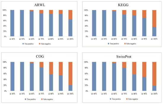 As stated above, the genes extracted by the KEGG_Extractor provided a reference archaeal dataset of the WL pathway (ARWL). The partial genes or the not satisfiable genes were filtered through the Seqkit. Furthermore, we also compared the accuracy of the newly constructed ARWL database with that of other databases. The results showed that all methane cycling genes of the WL pathway were correctly assigned to their targeted gene families at the 40% and 50% sequence similarity in the four databases. When the sequence similarity increased to 60%, there existed two false negative genes (sequences with their gene names not predicted) in the four databases (Figure 5). When the threshold improved from 70% to 100%, the false negative rate of the newly constructed database ARWL increased from 13% to 35%. In contrast, the false negative rate of KEGG database increased from 17% to 65%, that of the COG database increased from 19% to 80%, while that of the SwissProt database increased from 20% to 81% (Figure 5). In particular, when the sequence similarity reached 100%, the number of sequences without predicted gene names was 43 and 44 in the COG and the SwissProt database, respectively. However, there were only 19 false negative genes in the WLDB database, indicating a high species-specific characteristic of this database. Therefore, the results showed that the ARWL database performs better over a 70% identity threshold than the other KEGG tools. It represented high accuracy and comprehensiveness over other orthology databases in methane cycling analysis of the WL pathway. The ARWL database has several important features for analyzing CH4 cycling processes compared to the currently available orthology databases, such as the COG, SwissProt and KEGG. It contained the most comprehensive gene families in the ancient WL pathway of methane cycling. These gene families are based on the most current knowledge and up-to-date research progress in methane cycling of the archaea. This also indicated that the ARWL database constructed through the KEGG_Extractor performed well in the sequence accuracy, and it had high species specificity.