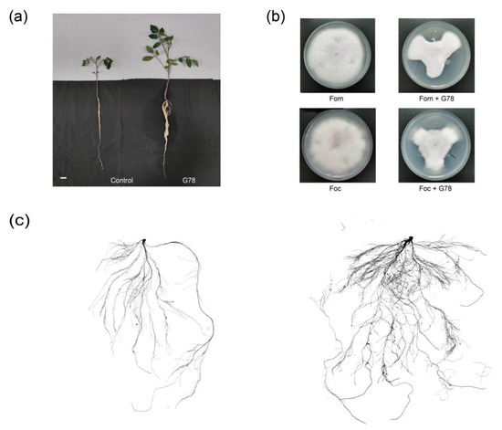 The plant growth promotion ability and antagonistic activity against pathogenic fungi through the dual-culture test of P. mucilaginosus G78 strain. (a) The effects of G78 strain on the growth of tomato plant. Bar, 2 cm. (b) The growth of F. oxysporum f. sp. momordicae and F. oxysporum f. sp. cubense with or without G78. Fom, F. oxysporum f. sp. momordicae; Foc, F. oxysporum f. sp. cubense; Fom+G78 or Foc+G78, F. oxysporum f. sp. momordicae or F. oxysporum f. sp. cubense with G78. (c) The root scanning image of tomato plants. G78, the treatment which was inoculated by G78; control, the uninoculated treatment.
