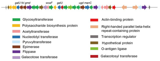 Predicted exopolysaccharide gene cluster for P. mucilaginosus G78. The predicted functions of each color-coded ORF are indicated at the lower bottom panel.