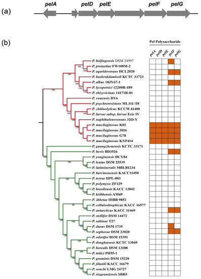 pel-like operon of P. mucilaginosus G78 and genes involved in Pel-polysaccharide of 41 Paenibacillus strains. (a) pel-like operon architectures of P. mucilaginosus G78. Arrows are used to denote open reading frames, with the direction of each arrow indicating the direction of transcription. (b) pelAEDFG genes of 41 Paenibacillus strains. Colored box represents the presence of a gene within a genome and white box indicates absence of a gene.