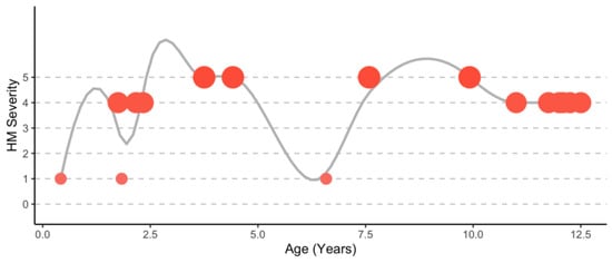 Global developmental delay (GDD) and intellectual disability (ID) are also highly prevalent in the SHM1 population (Table 4). Delays in head control, sitting, crawling, and walking are widespread. Sometimes, the motor delay resolves, while improvement is not apparent in other cases [5]. Decline in function was observed in one case, where the patient lost the ability to ambulate at an undisclosed age prior to the age of six, after a prolonged hemiplegic event [33]. Included are multiple cases of nonambulatory patients [10,32]. Dysarthria is frequently noted, regarding verbalization and verbal acuity (28.3%). Like lack of ambulation, multiple nonverbal patients are reported throughout this review [30,32,33]. ID is more ubiquitous than GDD and can range from mild to profound. With mild classification correlating to IQ scores from 50 to 69, moderate from 36 to 49, severe from 20 to 35, and profound below 20 [42]. Of the 30 patients identified with ID, 10/30 (33.3%) were not defined, 9/30 (30%) were listed as mild, 4/30 (13.3%) were classified as moderate, and 7/30 (23.4%) were severe with no patients grouped in the profound class [5,6,28,29,31]. For nonverbal patients, the specific degree of impairment can be difficult to assess but estimates using IQ testing and other means were included in many of the studies [5,6,9,10,23,24,28,29,31,33,34,36,39]. Autism spectrum disorder (ASD) was documented in only 3 of the 48 patients (6.25%) [6,33].