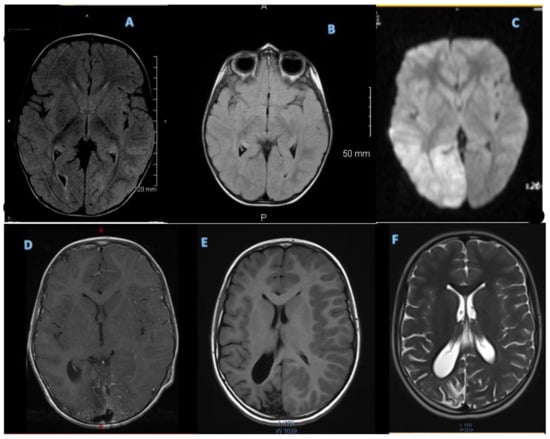 (A) Two years and 4 months (3rd attack—1st with hemiplegia) showed medial left temporal lobe edema (FLAIR imaging). (B) Two years and 5 months (no attack) normal (FLAIR imaging). (C) Diffusion-weighted imaging (DWI) at 3 years 9 months during 4th attack HM episode, showing increased signal in right occipital lobe. (D) Contrast-enhanced TI imaging at 4 years showing increased enhancement in right occipital lobe during 5th HM episode. (E) TI imaging at 7 years during 6th attack showing atrophy in right occipital lobe. (F) T2 imaging performed at 11 years during minor HM episode, demonstrating stable atrophy on the right occipital lobe without associated edema.