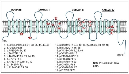 Twenty variants were identified among the 48 patients: 18 of them were missense, one was a deletion, and one disrupted a splice site. Almost all the variants were located either in the voltage sensor (S4) or in the pore-forming channel (S5-loop-S6) of any of the four domains (DI-DIV). The two exceptions were one alteration of a splice site (c.3825+1G>A) and the p.Phe363Ser substitution (p.F363S in Figure 3), which is situated on the I–II linker near the α-interaction domain (AID). The highest concentration of mutations, 9 of the 20, were positioned in domain III (45.0%), and 4 of them spanned the S4 voltage sensor (Figure 3). The amino acid substitutions varied from staying within polarity and hydrophilic/hydrophobic grouping to significant alterations such as going from nonpolar to polar or vice versa. Moreover, some shifts included exchanging a positively charged amino acid for a neutral one.