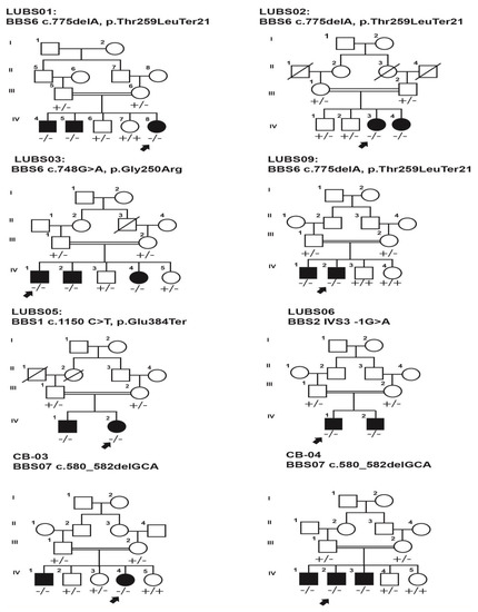 Pedigrees affected with Bardet-Biedl Syndrome carrying known variations in BBS genes.