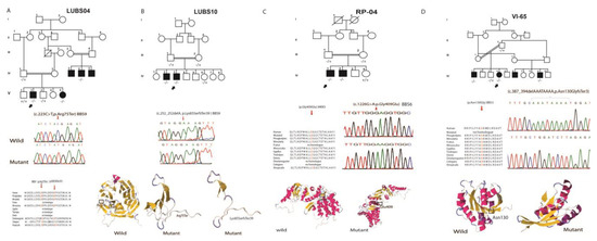 The human assembly GRCh37/hg19 was used for reference alignment [18]. WES was performed in individuals; IV-8 of LUBS01, IV-3 of LUBS02, IV-1 of LUBS03, IV-2 of LUBS09, IV-2 of LUBS05, IV-1 of LUBS06, IV-1 of RP-04, IV-4 of VI-65, IV-4 of CB03 and IV-2 of CB04. Additionally, both parents and all siblings of all families were genotyped for the found variants by sanger sequencing.