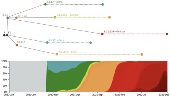 Evolutionary history of main SARS-CoV-2 VOCs. This illustration shows the emergence, establishment, and genetic relationships of the main VOCs according to current knowledge. It also includes a graph describing the predominance of every VOC over time, which we obtained with Nextstrain based on data from GISAID [27,28].