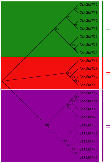 Phylogenetic analysis of ASMT genes in C. sinensis. The phylogenetic tree was constructed based on the sequences of CsASMT proteins using the neighbor-joining method with bootstrap analysis (1000 replicates) in MEGA X.