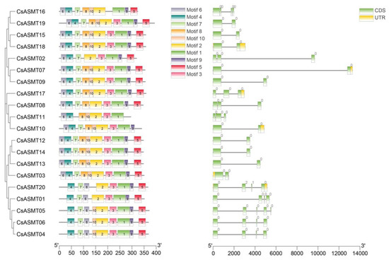 To better characterize the diversity of the CsASMT proteins, the AA sequences of the 20 genes were analyzed using the MEME online tool, revealing a total of 10 different motifs, namely, motifs 1–10 (Figure 2), whose corresponding protein sequences ranged from 15 to 50 AAs in length. The distribution of most of the gene motifs was relatively concentrated. Motifs 1, 2, and 4 were present in all genes (Figure 2), indicating that these proteins were highly conserved during the evolution of the tea plant. However, CsASMT11 was unique because it did not contain motifs 5, 7, or 9, which were present in most genes. Similarly, individual genes showed minor differences in motif distribution when comparing subclade members or members of the same subclade branch, which indicates that the ASMT genes in tea plants underwent different selection pressures and evolutionary processes. Our gene structure analysis showed that all CsASMT genes contained introns; 20% of them contained three introns, while the rest contained one or two introns. The comparison also revealed that the genes with a higher number of introns had a relatively lower motif number, which confirmed the previous conclusion that the number and length of introns may be related to the loss of conserved motifs as a result of evolutionary processes.
