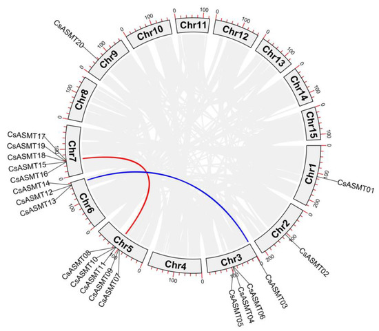 The chromosomal localization analysis of the ASMT gene family members revealed that the 20 genes were located on seven chromosomes (Figure 3). Five CsASMT genes were distributed on chromosomes 5 and 7, whereas only one was detected on chromosomes 1 and 2. The collinearity analysis showed that only two pairs of the 20 ASMT genes, namely, CsASMT03/CsASMT13 and CsASMT10/CsASMT17, had a linear relationship (Figure 4). Thus, we concluded that the ASMT gene family expansion occurred via fragment replication. In the analysis of the replication event time, the Ka/Ks ratios of the two gene pairs were lower than 1, and these genes suffered from an evolutionary negative purifying selection over 19.78 to 34.66 million years (Table 2).