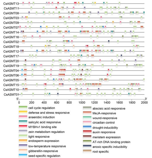 Cis-element analysis of C. sinensis ASMT gene promoters. The binding sites of promoter regions are indicated by the different colored boxes.