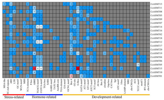 Distribution of the number of cis-acting elements in the C. sinensis ASMT gene promoter.