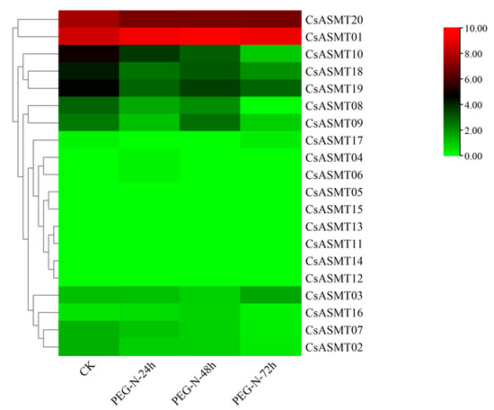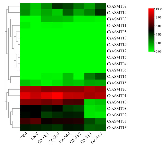 Heat map of FPKM expressions of C. sinensis ASMT genes under drought stress based on RNA-Seq data. FPKM values were all log2-processed, and heat map clusters were constructed. The color scale representing relative expression values is shown on the left.