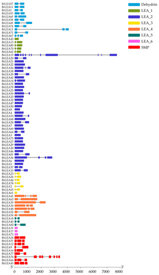 In addition, research has indicated that the LEA_2 subfamily genes are the most numerous in higher plants. We also obtained similar results concerning BrLEA. In addition, in wheat, the number of members of the LEA_2 subfamily is more than half of the total number of members [21], and, in rye, the number of members of the LEA_2 subfamily accounts for about half of the total [25]. There are also differences in the number of members in each subfamily of different species. The number of members of the LEA_4 subfamily is the largest in cabbage [26], while the Dehydrin subfamily has the largest number of members in rice. The members of the same subfamily have similar gene structures, and there are great differences in gene structures among members of different subfamilies. It can be speculated that the same subfamily genes may have functional similarities, which offers scope for predicting related genes and functional analysis. A large number of studies have found that the LEA protein family in higher plants may be larger and more complex than those currently reported, especially for LEA_2 subfamily proteins [27].