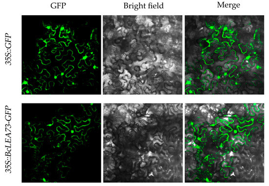 We merged the full-length open reading frame (ORF) of BcLEA73 and green fluorescent protein (GFP) into the pCAMBIA2300-35S::GFP vector. The experimental method and operation steps for subcellular localization were consistent with the construction of the overexpression vector. The constructed vector was transferred to Escherichia coli, and the bacteria were preserved. Tobacco was selected as the infection material for subcellular localization.