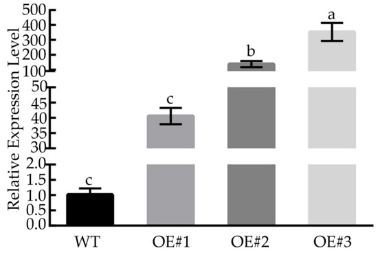 Relative expression level detection of transgenic Arabidopsis-resistant plants. Bars with different letters “a, b, c” above the columns indicate significant differences (p < 0.05, Duncan’s range test) on a given day of treatment. Relative gene expression levels were calculated using the 2−ΔΔCT method.