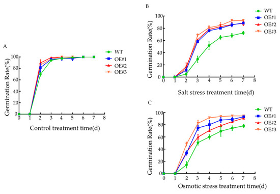 Effects of different stresses on the seed germination rate of transgenic Arabidopsis thaliana. (A) Half MS Petri dish. (B) Half MS Petri dish containing 150 mM NaCl treatment. (C) Half MS Petri dish containing 250 mM mannitol treatment.