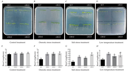 Effects of different stress treatments on the root length of Arabidopsis thaliana (A,E) half MS Petri dish. (B,F)—Half MS Petri dish containing 250 mM mannitol treatment. (C,G)—Half MS petri dish containing 150 mM NaCl treatment. (D,H)—Half MS petri dish treated at a low temperature of 4 °C. Bars with different letters “a, b, c” above the columns indicate significant differences (p < 0.05, Duncan’s range test) on a given day of treatment.
