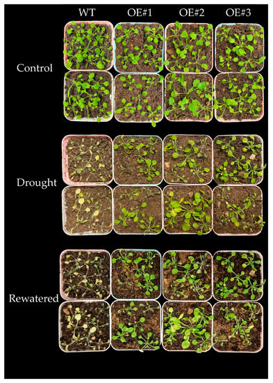 The overexpression lines of transgenic Arabidopsis OE#1, OE#2, and OE#3 were selected for drought treatment together with WT. After 10 days of drought treatment, it was observed that the WT plants were more severely damaged than BcLEA73-OE. Specifically, the WT plants had more yellow and dry leaves, and more plants had died. After resuming watering for three days, the growth status of most BcLEA73-OE plants was restored, while almost all WT plants were dead (Figure 13).