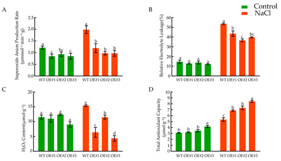 The results showed that, after salt stress treatment, the production rate of superoxide anion in the WT plants increased significantly and was significantly higher than that of BcLEA73-OE (Figure 14A). The conductivity was significantly higher than that before treatment, and the conductivity of BcLEA73-OE was significantly lower than that of WT (Figure 14B). Under cold stress, the H2O2 content of BcLEA73-OE was significantly lower than that of the WT plants (Figure 14C). The total antioxidant capacity of the Arabidopsis plants was enhanced, and the total antioxidant capacity of BcLEA73-OE was significantly higher than that of the WT plants (Figure 14D).