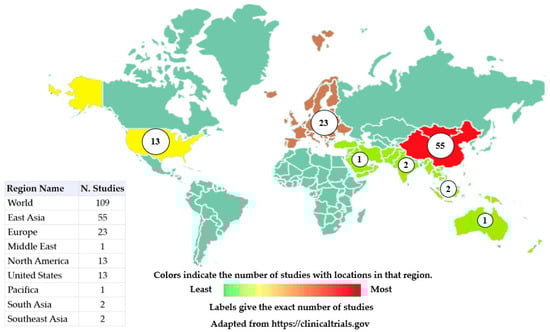 Global distribution of clinical trials using terms Omics and Cancer. Clinical studies that have omics and cancer as keywords are shown here. Studies in East Asia correspond to 50.46% of clinical trials, European studies correspond to 21.10%, and United States correspond to 11.92% of all clinical trials. Colors indicate the number of studies located in the region, ranging from green (least studies) to red (most studies). Studies with no location are not included in the counts or on the map and studies with multiple locations are included in all corresponding regions.