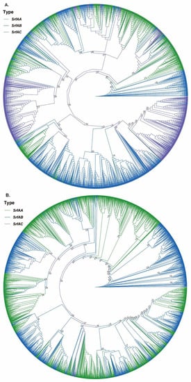 Phylogenetic analyses were conducted on the 17 largest OGs containing members of all three gene families (OG0004815 was excluded because it had no SrfAC genes). In each of the constructed phylogenetic trees, it was observed that SrfAA, SrfAB and SrfAC genes often clustered with each other while seldom forming separate monophyletic branches for different gene types, suggesting a high identity of the sequences within the SrfA operon and close evolutionary relationships among different genes (Figure 1 and Supplementary Figures S1–S17). These results are in accordance with the above-mentioned high sequence similarity among the SrfA operon genes. All evidence supports a hypothesis that the complete operon is probably derived from self-duplication of only one gene, and further module fusion and recombination may have led to the formation of the complete operon.