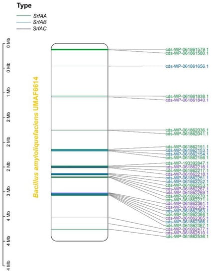 Distribution of SrfAA, SrfAB and SrfAC genes in Bacillus amyloliquefacieus UMAF6614 (GCF_001593785) genome.