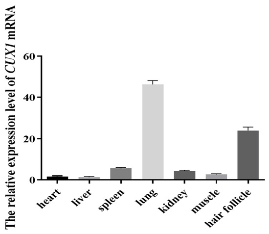 The CUX1 expression levels in heart, liver, spleen, lung, kidney, dorsal muscle, and skin samples were determined by RT-qPCR. CUX1 expression was relatively high in the skin, suggesting that CUX1 may be involved in the regulation of hair follicle development (Figure 1).