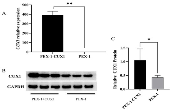 DPCs were transfected with PEX-1-CUX1, and the mRNA and protein expression levels of CUX1 were detected by RT-qPCR and Western blot (WB), respectively. CUX1 mRNA expression (p < 0.01) (Figure 2A) and CUX1 protein expression (p < 0.05) (Figure 2B,C) were significantly increased, confirming that the plasmid could be used in subsequent experiments.