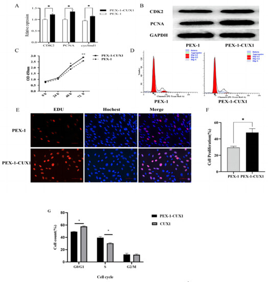 Overexpression of CUX1 promoted proliferation of Hu sheep DPCs. (A) mRNA expression levels of PCNA, CYCLIN D1, and CDK2 after CUX1 overexpression. (B) The relative expression levels of CDK2 and PCNA protein after CUX1 overexpression. (C) OD450 values in the CCK8 assay after CUX1 overexpression. (D) Cell-cycle analysis of Hu sheep DPCs overexpressing CUX1 by flow cytometry. (E) The number of proliferating Hu sheep DPCs after CUX1 overexpression was detected by the EdU assay. EdU staining (red) indicates proliferating cells; Hoechst staining (blue) indicates nuclei. (F) The proportion of EdU-positive Hu sheep DPCs. (G) The rate of different periods of the cell cycle * p < 0.05, ** p < 0.01.