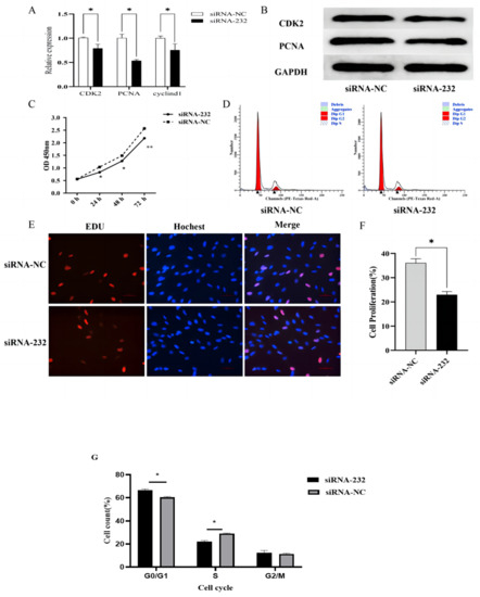 DPCs were transfected with three different CUX1 knockdown fragments. CUX1 mRNA levels were determined by RT-qPCR. The siRNA-232 group showed the strongest reduction in CUX1 mRNA expression (Figure 3A). Next, CUX1 protein expression in the siRNA-232 group was determined by WB. It was found that siRNA-232 significantly downregulated the protein expression of CUX1 (p < 0.05) (Figure 3B,C). Based on these results, siRNA-232 was selected for subsequent experiments.