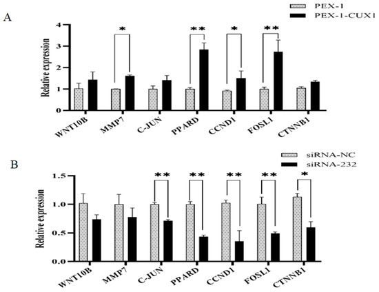 Expression of Wnt/β-catenin signaling pathway genes after CUX1 overexpression or knockdown. (A) mRNA expression levels of different genes after CUX1 overexpression. (B) mRNA expression levels of different genes after CUX1 knockdown. * p < 0.05, ** p < 0.01.