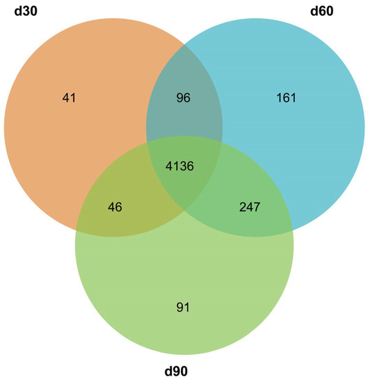 The mapped reads were aligned with the miRBase database for the identification of conserved miRNAs, and miRDeep2 software was used for the prediction of novel miRNAs. In total, 4103, 4429, and 4307 known miRNAs were identified, and 216, 211, and 213 novel miRNAs were predicted in each of the three groups. The length distribution of the identified known miRNAs and new miRNAs showed that the miRNAs detected in this study were 18–28 bp in length, and most of them were concentrated at 20–24 bp, with 22 bp being predominant (Figure 1). The expression abundance data were generated by homogenizing miRNA expression across different samples; Table 2 and Table 3 show the top 20 known and novel miRNAs with the highest levels of expression in all three groups. Among all the identified miRNAs, 4136 were expressed in d30, d60, and d90, and 41, 161, and 91 miRNAs were specifically expressed in groups d30, d60, and d90, respectively (Figure 2).