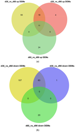 Venn diagram of differentially expressed miRNAs. In the Venn diagram, the number of overlapping triangular regions represents the number of common DEMs among the corresponding comparison combinations (d30 vs. d60, d90 vs. d60, and d30 vs. d90), and the non-overlapping region represents the unique differential genes in each comparison combination. (a) The up-regulated DEMs in three comparison groups; (b) The down-regulated DEMs in three comparison groups.