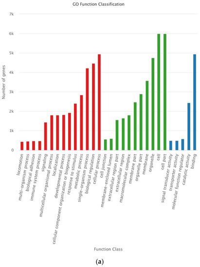 We examined the roles played by the target genes of the DEMs to better understand the roles of miRNA target genes in antler growth centers during various growth phases. The results of the GO enrichment analysis showed that the target genes of differentially expressed miRNAs were significantly enriched in 30 GO categories (p < 0.05) in all three comparison groups, including “cellular process”, “biological regulation”, and “single-organism process” in Biological Process (BP); “cell part”, “cell”, and “organelle” in Cellular Component (CC); and “binding” and “catalytic activity” in Molecular Function (MF) (Figure 4).