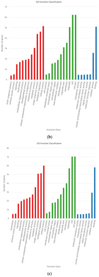 GO classification of target genes for DEMs in different comparison groups. (a) GO classification of target genes for DEMs in d30 vs. d60; (b) GO classification of target genes for DEMs in d30 vs. d90; (c) GO classification of target genes for DEMs in d60 vs. d90.